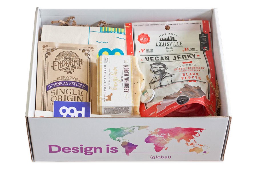 Everyone received the same box, packed with products from some of our favorite customers, with packaging designed by our global community of talented designers. We included delicious gourmet chocolate made in San Francisco by Endorfin Foods and designed in Romania by maximage, wonderful-smelling soap handmade in Washington by North Whidbey Farm, and the best vegan jerky we’ve ever had from Louisville Vegan Jerky Co. in Kentucky, with packaging by Mj.vass from Cyprus