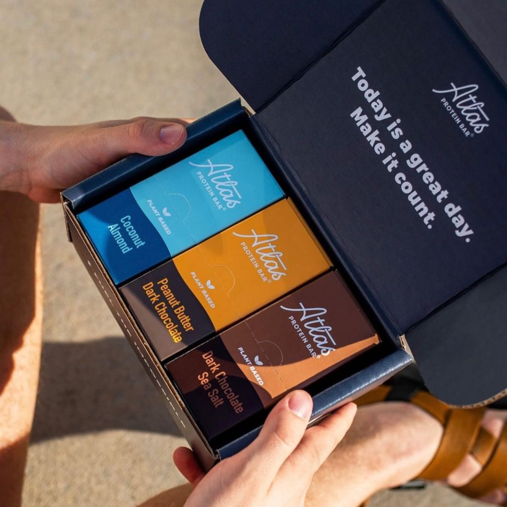 @atlasbars, a business that provide plant-based protein bars, uses their brand name and logo consistently across the different products they offer. It helps build recognition even if they are offered in different colors.
