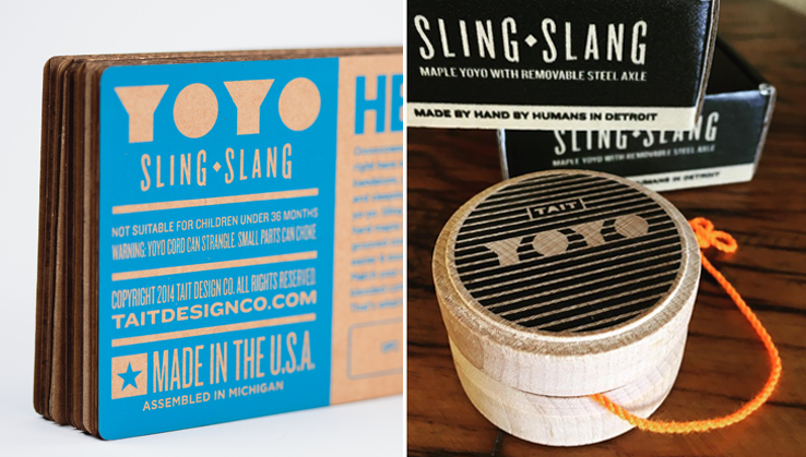 Take, for example, the toys from TAIT Design Co. are proudly made in the U.S.A. Not only do they cleverly mention their products are “Made by hand by humans in Detroit,” but they include a circular shape on their boxes, a reflection of the shape and size of the yoyo inside. These instantly capture the child at heart in all of us, and boast an American pride.